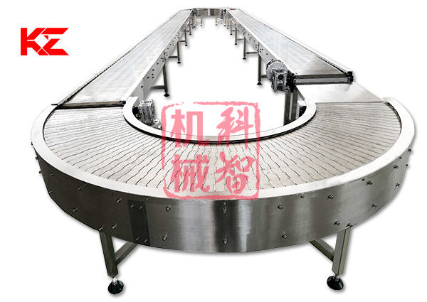 轉彎輸送機采用的形式有:網帶轉彎輸送機、鏈板式轉彎輸送機、皮帶式轉彎輸送機、鏈桿式轉彎輸送機、塑料模塊式轉彎輸送機等。轉彎角度有45度、90度、180度等等。轉彎食品輸送機的寬度和轉彎半徑均可根據需求定做。
